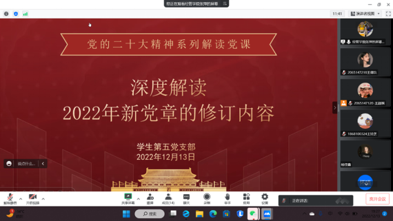 高瞻远瞩绘蓝图,踔厉奋发谱新篇。为深入学习宣传贯彻党的二十大精神,引导支部党员牢固树立党章意识,全面理解党章内容,时刻遵守并践行党章,2022年12月13日晚,bat365正版唯一官网学生第五党支部组织开展党的二十大精神系列党课之学习《中国共产党章程(修正案)》。由党支部书记主讲,全体党员参加。