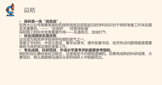 王学姐保研至辽宁大学世界经济专业。她从学习成绩,科研经历,社会实践方面进行了经验分享。她重点分享了,从读研目的,选择硕士的类型,自我能力的认知以及复试中外语水平提高,对经济热点问题的关注方面。