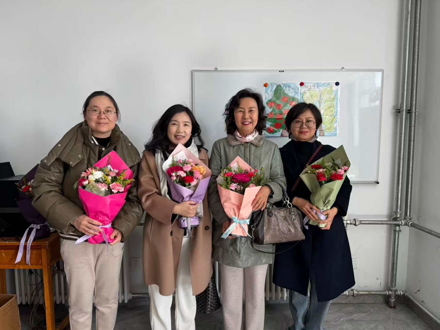 活动现场暖意融融、花香四溢。学院工会工作人员将一束束精心挑选的鲜花与电影票送到每一位女教师手中,向大家致以节日的问候与诚挚祝福。接过鲜花与礼品,老师们纷纷表示这份贴心礼物与暖心关怀,让大家真切感受到学院大家庭的温暖。