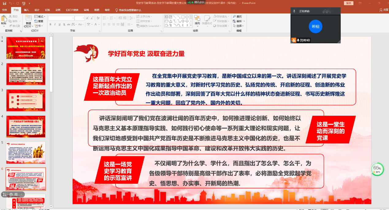 由于学院大四毕业生整体在外实习,而党员中大四毕业生党员居多,所以党课借助腾讯会议平台采取了线上讲授的方式。