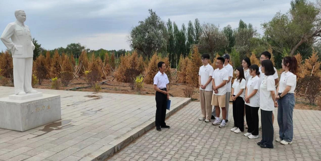 杨力生书记是磴口县第一位县委书记,曾带领县人民用箩筐筑起25公里人工防洪堤大坝和营造了一条308华里的防风固沙林带。实践团成员实地参观防沙林,深深体会革命先辈建设防沙林的不易。并前往杨力生墓进行祭扫。以革命先烈的精神作为标杆,加以继承和发扬。