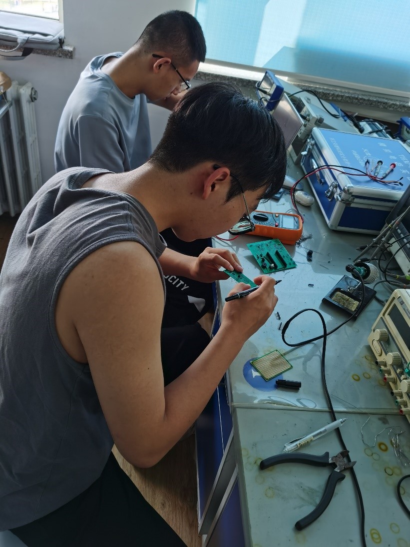 在学院领导的大力支持下,竞赛开展了有效的培训计划,从大一开始就进行了有计划的培训活动,这些保证了竞赛持续稳定产出。赛前宋其江组织竞赛指导教师王立峰、李丹丹等利用周末时间,在508实验室进行了6次赛前培训活动,指导元器件和仪器仪表使用、电路设计和仿真、单片机编程能力,通过蜂鸣器电路设计、温度报警、可控调光、可控云台等项目式训练,有力地培养了学生的实践能力,这些培训为本次比赛打下了坚实基础。培训和竞赛期间如图所示。希望通过有效竞赛机制运行,还有指导老师的持续投入,明年全国电子设计大赛取得更优秀的成绩,为培养一流人才贡献力量。