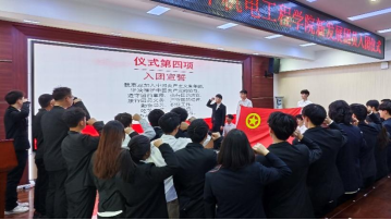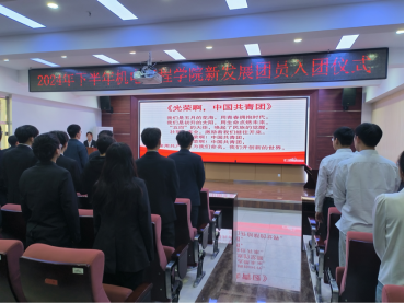 在鲜艳的团旗下,学院团委副书记刘昊翔同学带领全体新团员庄严宣誓。入团宣誓象征着新团员对共青团理念的认同,表明他们自愿接受共青团组织的领导,愿意遵守团的章程,将团的使命融入自己的价值观中,从此肩负起作为团员的责任和义务。
