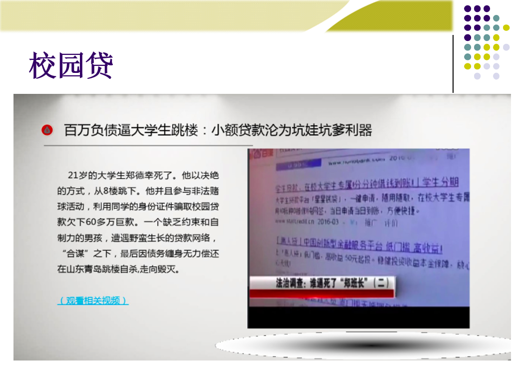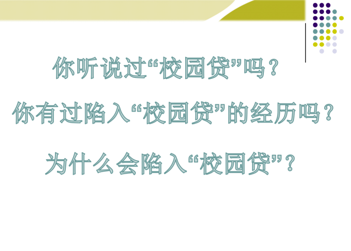 启发式提问:通过启发式提问,用问题创设的方式向同学们抛出关于“校园贷”的问题。