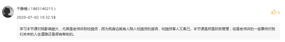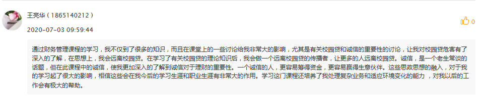 本课程在课程结束时,要求学生对课程中给涉及到的几个课程思政点的讨论进行感悟分享。通过学生在线上留言的反馈,大部分学生对校园贷的案例有很深的印象,通过资料查询和计算了解到校园贷的危害,起到了课程设计想要达到的知识、能力、素质目标。
