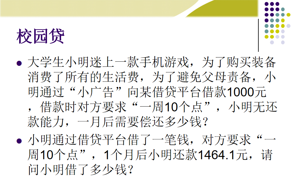 案例题目:远离“校园贷”,青春不欠债--货币时间价值的计算